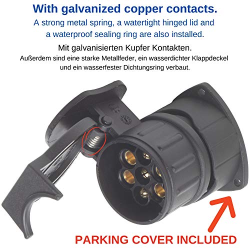 Adattatore Elettrico da 13 a 7 poli, Connettore per traino per Rimorchi e Roulotte, incluso Copertura per Gancio a 13 poli, impermeabile, ISO 11446 e ISO 1724, 12 V, adattatore di traino a 13 7 poli