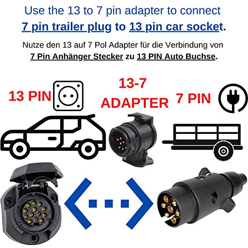 ✅[ASSEMBLAGGIO FACILE E SICURO] Montaggio dell'adattatore per rimorchio: collegare la spina a 7 poli del rimorchio con l'adattatore da 13 a 7 poli e fissarla con la linguetta a molla dell'adattatore - la spina a 13 poli si inserisce nella presa per auto a 13 poli.