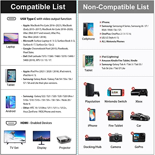 Ampia compatibilità: cavo da USB C a HDMI compatibile con MacBook Pro 2016-2023, MacBook Air 2018-2022, iMac 2017-2021, Mac Mini 2018-2023, iPad Pro 2018-2022, iPad Air 2020-2022, Surface Book 2/3, Surface Go/Go 2., Surface Laptop Go, Surface Laptop 3, Surface Pro 7/X, Chromebook, Dell XPS 17/15/13, Galaxy S22/S21/S20, Note 20/10/9, Tab S9/S8/S7, LG