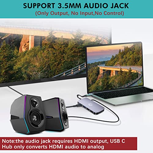 【Jack audio da 3,5 mm (nessun ingresso, nessun controllo, funziona con hdmi)】 Le porte audio da 3,5 mm possono essere collegate a auricolari, altoparlanti, ecc. ufficio e intrattenimento senza indugio. Il jack audio è solo una funzione di espansione del suono esterna, non regolazione del volume. E il jack audio richiede l'uscita HDMI, USB C Hub converte solo l'audio HDMI in analogico.