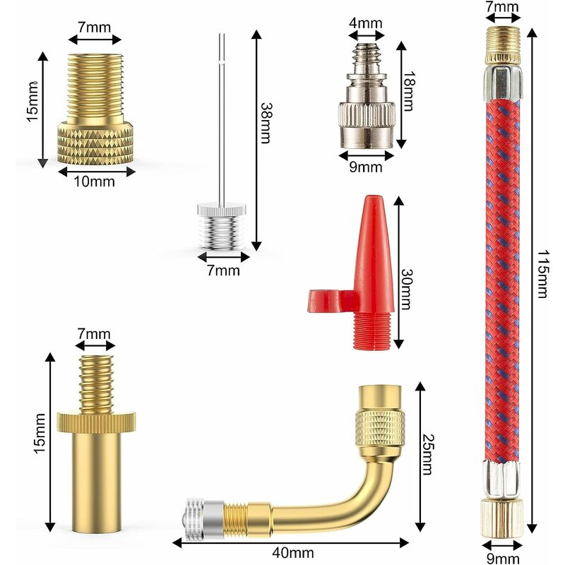 la maggior parte dei pneumatici per biciclette e la maggior parte dei palloni e dei materassi gonfiabili. Contenuto della confezione: 4 convertitori per valvole, 2 aghi di gonfiaggio, 2 estensori AV ad angolo retto, 2 x prolunga SV, 1 x ugello per aria compressa, 1 x tubo dell'aria. Materiale Materiale in ottone di alta qualità;