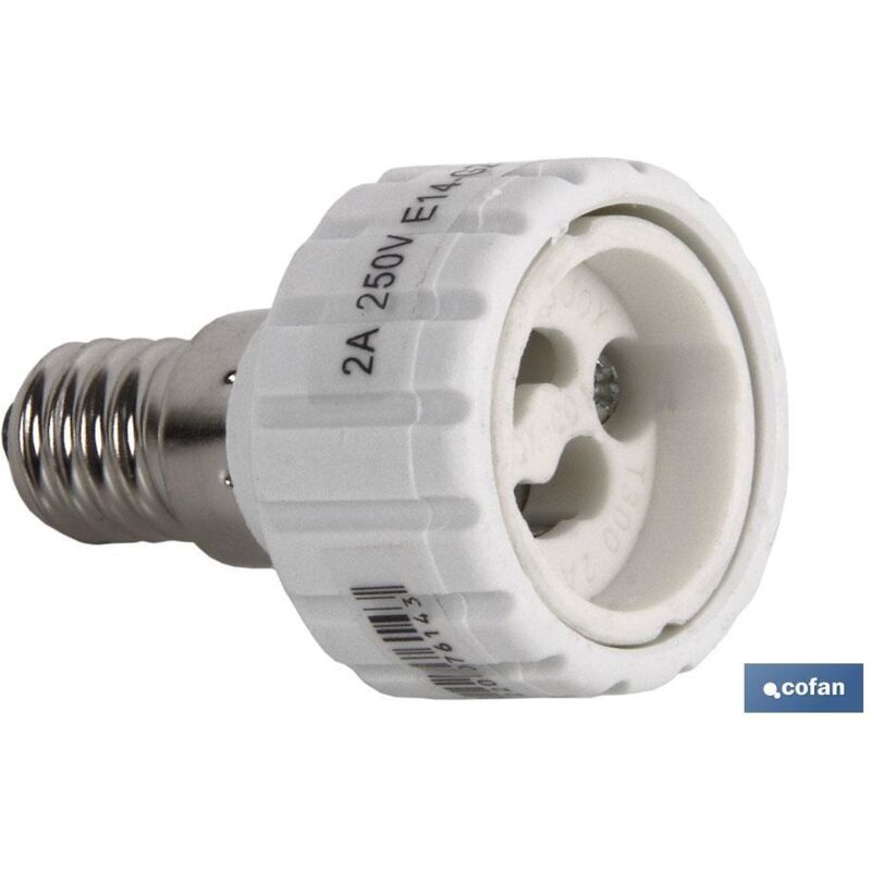 Portacampada adattatore. Da E27 a GU10/GZ10. 2 A - 250 V~. Colore bianco. Applicazioni comuni: Ambienti interni domestici e terziari (Interni di abitazioni, uffici, negozi, ecc.). Materiale termoplastico. Caratteristiche tecniche: Modello
