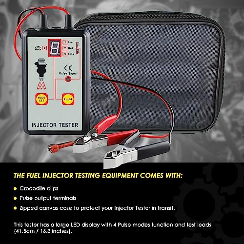 L'attrezzatura per il test degli iniettori di carburante viene fornita con clip a coccodrillo, terminali di uscita a impulsi e una custodia in tela con cerniera per proteggere il tester per iniettori durante il transito. Indicatore. Ampio display LED/4 modalità di impulso. Cavo di prova: 41,5 cm / 16,3 pollici.