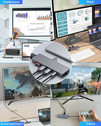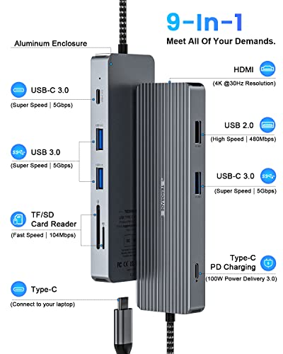 Espansione multiporta: l'hub USB C 9 in 1 estende la tua singola porta USB-C a 9 porte per tutte le tue esigenze. Dotato di 4 K a 30 Hz, ricarica PD di tipo C da 100 W, 3 porte USB 3.0, USB 2.0, porte USB-C 3.0 e slot per schede SD e TF. La custodia ultra sottile nasconde il massimo potenziale, perfetta per home theater, ufficio e resie.