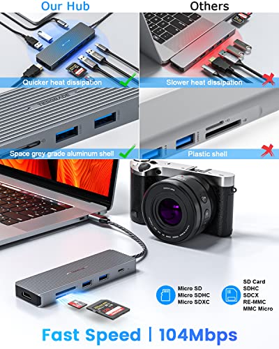 Design affidabile e amichevole: l'hub di tipo C ideale è piccolo e sottile, leggero e compatto, può essere facilmente inserito in una borsa e funziona sempre e ovunque con il tuo computer portatile. Il chip intelligente integrato a basso consumo energetico, dissipazione del calore più rapida e maggiore efficienza di trasferimento dei dati lo rende sicuro e affidabile quando sono occupate 9 porte.