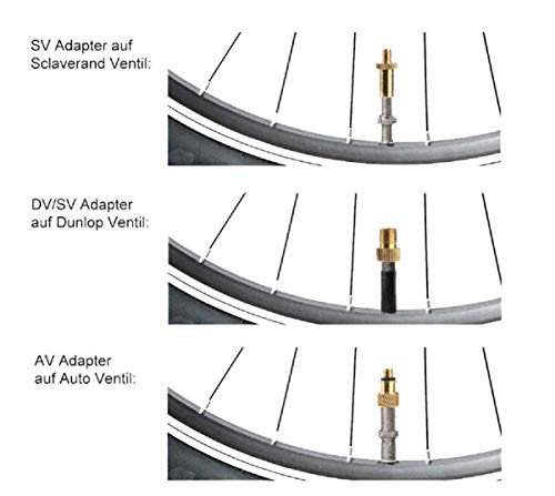 adatto per Dunlopventil (DV), Presta Ventil, Blitzventil (BV), Sclaverandventil (SV), Presta Ventil auf => Schrader/Autoventil (AV).