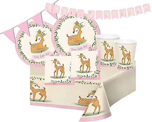 Kit n.17 set compleanno festa a tema cerbiatto coordinato sui toni del rosa per feste completa di piatti bicchieri tovaglioli e tovaglia