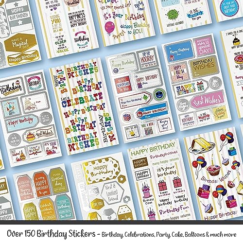 Adesivi per buon compleanno: ogni confezione contiene oltre 550 adesivi di alta qualità, 48 fogli di adesivi di alta qualità, 3 fogli per disegno, 16 fogli completamente diversi. Ci sono una miscela di adesivi di carta e adesivi in lamina d'oro e argento. Questi adesivi possono essere attaccati a biglietti, regali, regali, pareti, ecc. Questi temi di buon compleanno illumineranno qualsiasi biglietto, regalo o regalo e gli daranno quel tocco extra di premurosità.