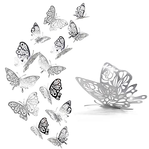 Adesivi Murali a Farfalla, 24 Pezzi Adesivi Murali di Arte 3D Autoadesivi Murali, Impermeabile Carta Kraft Farfalle Decalcomanie per Muro e Stanza, Arredamento Accessori Camera da Letto (Argento)