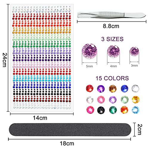 Set Di Adesivi: 1 adesivo con strass, per un totale di 900 pezzi, 15 colori, 3 misure di strass sono sufficienti per soddisfare le tue diverse esigenze decorative (3 mm, 4 mm, 5 mm). Il set include anche 1 pinzetta e 1 lima per unghie.