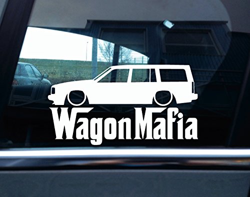 Adesivo con classica immagine di auto, Volvo 740 station wagon ribassata, con scritta "Wagon mafia" [lingua inglese]