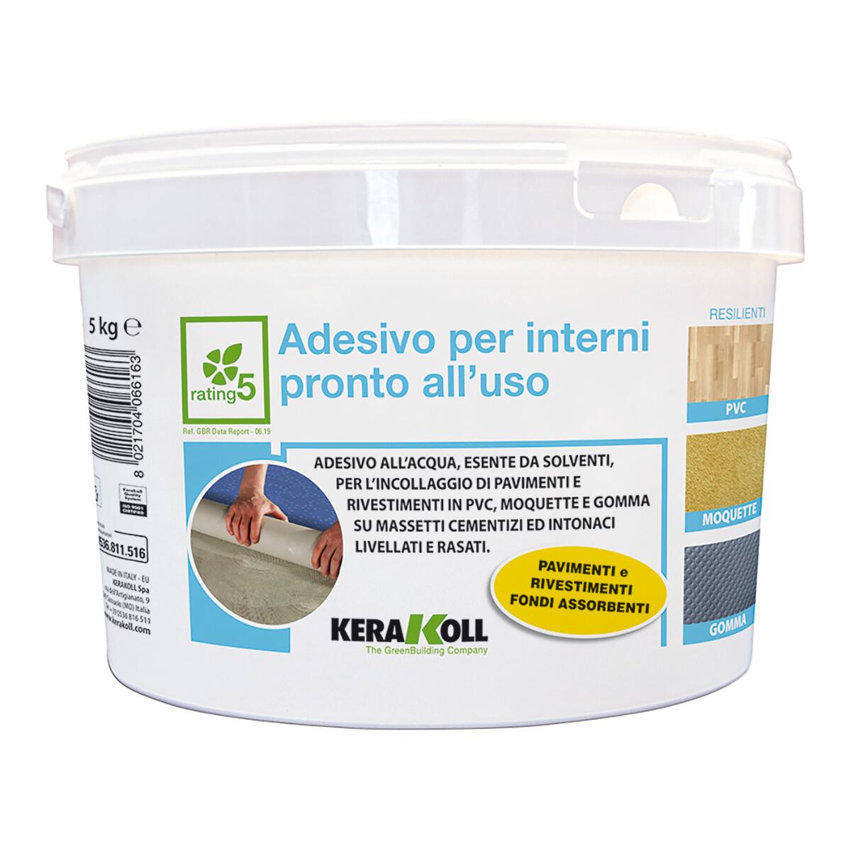 Adesivo organico minerale certificato. Idoneo per pvc, gomma, moquette, pavimenti e rivestimenti. Idoneo in interno su massetti cementizi livellati e rasati. PRONTO ALL'USO