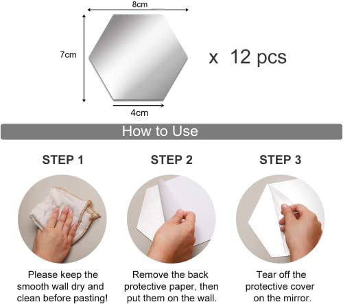 Dimensioni: forma esagonale, ogni dimensione è di circa 8 x7 cm. Il pacchetto include: 12 x adesivo da parete a specchio esagonale;