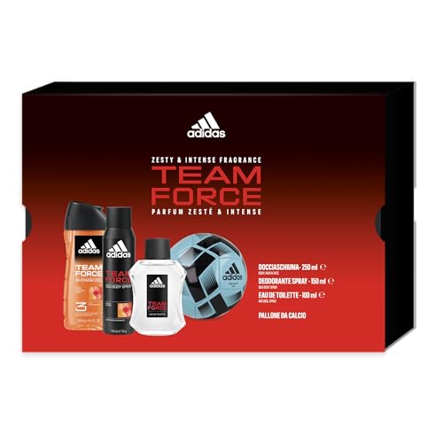 Adidas, Confezione Regalo Team Force, Eau de Toilette Uomo 100 ml, Gel Doccia Bagnoschiuma 250 ml, Deodorante Spray 150 ml, con Mini Pallone