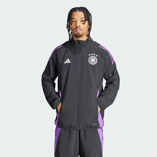Quando l'attenzione è su di te, assicurati di essere completamente a tuo agio. Pratica e confortevole, questa è la giacca che i giocatori della Germania indossano quando devono parlare davanti ai media di tutto il mondo. La tecnologia antiumidità AEROREADY li aiuta a mantenere la pelle asciutta mentre recuperano le energie, le tasche con zip sono perfette per custodire il telefono e gli altri oggetti essenziali. Lo stemma mostra a tutti che anche tu ti senti parte della squadra. Questo prodotto contiene almeno il 70% di materiali riciclati. Implementare la nostra produzione con materiali riciclati ci permette di ridurre gli sprechi, l'utilizzo di fonti non rinnovabili e l'impatto ambientale dei prodotti che produciamo. Vestibilità aderente. Zip integrale e collo alto a coste. Tela, 100% poliestere riciclato. Fodera in mesh. AEROREADY. Tasche anteriori con zip.