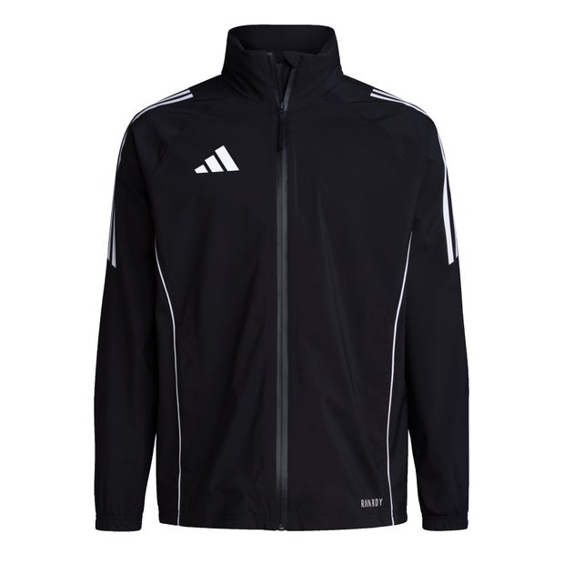 Take on the elements during football training in this adidas Tiro 24 jacket. When the wind and rain threaten to ruin your session, stay focused thanks to waterproof RAIN.RDY and the soft mesh lining. Then, once the worst is over, you can simply pack away the hood and get back to dominating every drill. This product is made with at least 70% recycled materials. By reusing materials that have already been created, we help to reduce waste and our reliance on finite resources and reduce the footprint of the products we make. Regular fit. Full zip with bungee-adjustable hood. 100% recycled polyester poplin. Mesh lining. RAIN.RDY. Front zip pockets.