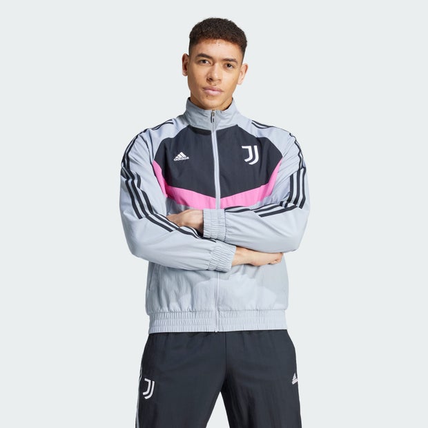 Make a football statement in this eye-catching adidas Juventus track top. When the action moves off the pitch, it'll keep you comfortable and focused thanks to soft woven fabric and zip pockets. But it's that embroidered club crest and bold chevron design that really steal the show. Zip it up and display your colours wherever your beautiful game takes you. This product is made with at least 70% recycled materials. By reusing materials that have already been created, we help to reduce waste and our reliance on finite resources and reduce the footprint of the products we make. Regular fit. Full zip with stand-up collar. 100% recycled nylon plain weave. Mesh lining. Front zip pockets. Elastic cuffs and hem.