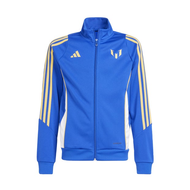 Paying tribute to the perfect team. An ideal training ground layer, this juniors' top belongs to a collection inspired by adidas Messi footwear. That two-tone zip borrows its bright colours from classic boot designs. That Lionel Messi logo shows where you find your football inspiration. Moisture-wicking AEROREADY keeps you comfortable while you're covered up. Made with 100% recycled materials, this product represents just one of our solutions to help end plastic waste. Slim fit. Full zip with stand-up collar. 100% recycled polyester doubleknit. AEROREADY. Front zip pockets.