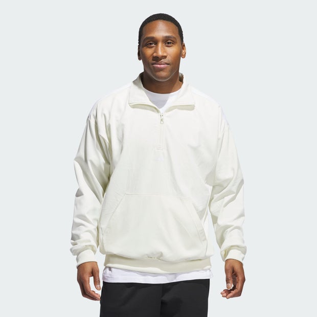Push through intense on-court drills or hit the weights in a cold gym — this adidas hooded sweatshirt moves with you. A loose fit gives you a full range of motion, while ribbing on the cuffs and hem seal in warmth. Whether you're perfecting your jump shot or pounding the pavement, this jacket is built to handle the demands of an athlete in action. This product is made with 100% recycled materials. By reusing materials that have already been created, we help to reduce waste and our reliance on finite resources and reduce the footprint of the products we make. Loose fit. Quarter zip with stand-up collar. 100% recycled polyester dobby. Kangaroo pocket. Ribbed cuffs and hem.