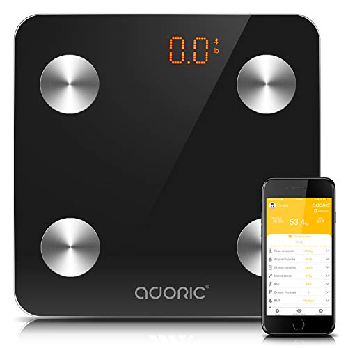 Adoric Bilancia Diagnostica Digitale Wireless, Grasso Corporeo Bilancia per IOS e Android, Misura Peso, Grasso, Liquidi, Massa Muscolare, BMI, BMR, Massa Ossea e Grasso Addominale.(Nero)