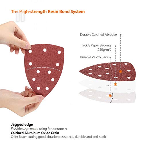 Materiale: ossido di alluminio abrasivo. Con il taglio di parti seghettate, i fogli multi-levigatrice sono facili da dividere in due metà. Gancio e anello, facile e veloce da applicare.