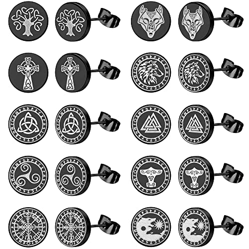 ✪【ORECCHINI NERI】10 paia di orecchini neri in acciaio inossidabile tra cui vegvisir, lupi yin-yang, nodo triquetra, testa di lupo, albero celtico, simbolo del martello di thor, gioielli punky e vintage, vichinghi per uomo donna.