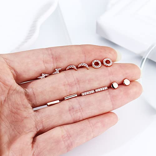 Dainty Stud Earrings Set- 6 paia di orecchini a bottone con cartilagine sono disponibili in un set, 3 colori disponibili. Un ordine include orecchini a bottone con fulmine, bottone a luna, bottone a cerchio, bottone ad aureola e bottone a barra. Fulmine, luna e cerchio saranno una nuova moda, l'abbinamento perfetto per qualsiasi outfit. Questi orecchini minimalisti sono semplici e dall'aspetto delicato, classici ed eleganti, adatti sia per uomini che per donne.