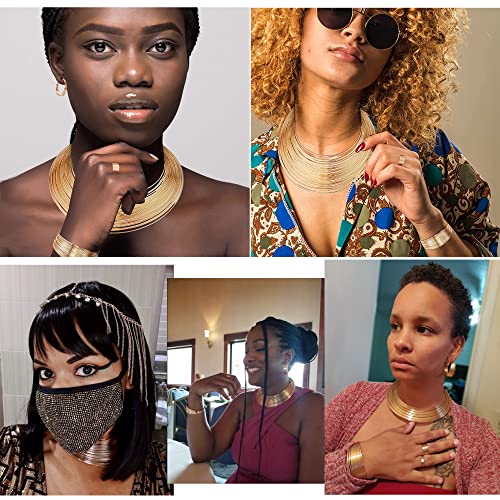 【Set di gioielli di dichiarazione】 - Un ordine include 1 collana girocollo con pettorina aperta robusta, 1 bracciale polsino, 1 paio di orecchini a cerchio aperti e 1 anello aperto per PC, tono oro, tono oro rosa, tono argento sono disponibili, perfetto africano Set di gioielli di tendenza per donne e ragazze