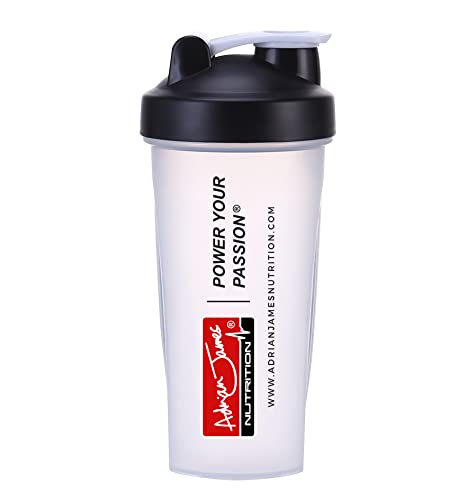 Adrian James Nutrition - Flacone per proteine, con sfera miscelatore, coperchio avvitabile a tenuta stagna e tappo a scatto sicuro, 100% senza BPA, 600 ml