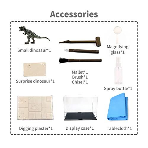 Giocattolo archeologico: il kit di scavo con dinosauri include 1 piccolo dinosauro, 1 martello, 1 pennello, 1 scalpello, 1 lente di ingrandimento, 1 flacone spray, 1 intonaco da scavo, 1 vetrina, 1 tovaglia, 1 manuale di istruzioni (vetrina) e 1 dinosauro a sorpresa.