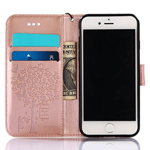 Aeeque Flip Cover iPhone 7 PLUS Portafoglio in Pell PU Farfalla Albero e Ragazza [Oro Rosa] Custodia a Libro per iPhone 7 PLUS (2016) 5.5 pollici con Chiusura Magnetica/ Porta Carte/ Supporto Protettivo Rigida