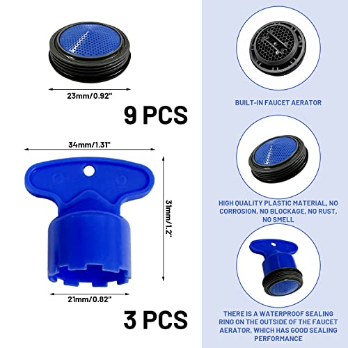 Contenuto della confezione: riceverete 9 aeratori per rubinetto M24, 3 chiavi per aeratore, la dimensione dell'aeratore è di 23 mm, adatto per rubinetti con filo interno da 24 mm, la chiave aiuta a installare e rimuovere facilmente il filtro, la quantità è sufficiente per soddisfare le vostre esigenze di utilizzo e sostituzione.