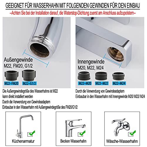 ➤【 Viene fornito con molteplici adattatori di filettatura】 Abbiamo fornito un totale di 5 adattatori di filettatura, ovvero M22-M20/ M22-M22/ M22-M24/ M22-FM20/ M22-G1/2 (la filettatura femmina M22 dell'aeratore del rubinetto può essere convertita in filettatura maschio M20/M22/M24 e filettatura femmina FM20/G1/2).