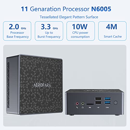 AEROBUCKS Mini PC 11a Gen Processore Pentium N6005 (fino a 3,3 GHz) Windows 10 Pro Supporto Win 11, 8G DDR4/256G SSD Mini Computer Desktop HDMI + DP Dual 4K 60HZ + VGA USB*6 BT4.2 Dual 2.4G/5G WIFI