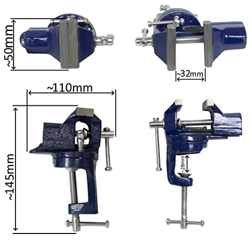 Dimensioni: Altezza totale della morsa: 145mm. Larghezza totale della morsa: 110mm. Larghezza della ganascia: 50mm. Apertura della ganascia: ~ 32mm. Peso unitario: 970 g. Materiale: fabbricato in ghisa. Colore: blu