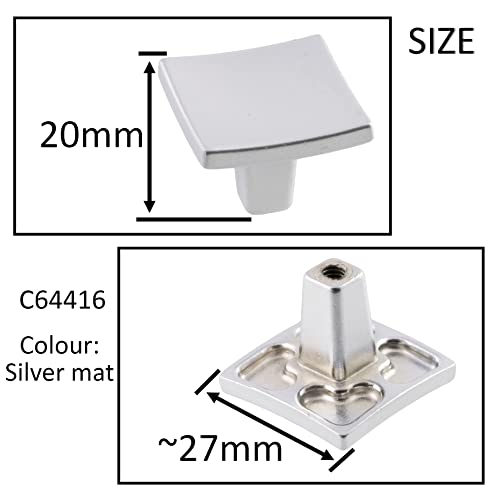 Dimensioni: Altezza: 20mm. Lunghezza: 27mm. Larghezza: 27mm. Peso del set: cioè - 1 pomello per mobile + 1 vite = 21 g. La viteria è incluso. Materiale: metallo. Finitura: argento opaco