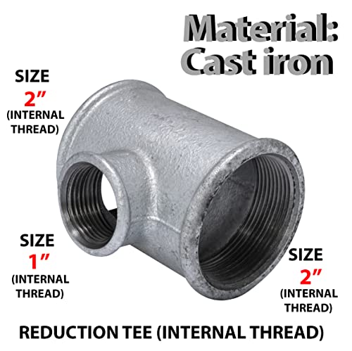 Dimensioni: Taglia: 2" x 1". Filettatura interna femmina-femmina-femmina. Peso unitario: 613 g. Materiale: ghisa. Finitura: zincata