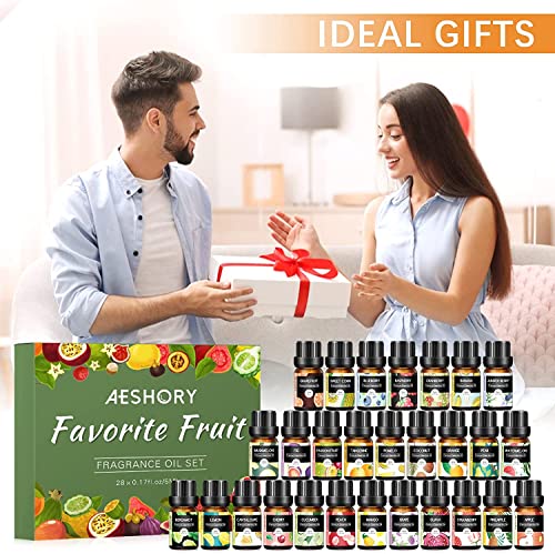 AESHORY Set di Oli Essenziali Fruttati 28 x 5ML, 100% Olio Essenziale Naturali per Diffusori, Aromaterapia, SPA e Massaggio - Limone, Arancia Dolce, Ciliegia, Uva, Mango, Cocco, Ananas, Fragola,