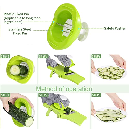 MATERIALI SICURI: affettatrice Mandolina viene fornita con lame in acciaio inossidabile 304 per uso alimentare. Il corpo del dispositivo di scorrimento è composto da ABS per alimenti privo di BPA al 100%