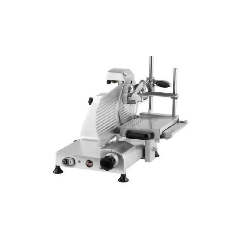 Codice RS0056 - Affettatrice con lama verticale d.300 per salumi, modello FC-F300TS-VR CE PRO, dimensioni cm. 36(52)x46(61)x52 (lxpxh), 230 volt, 370 watt, spessore di taglio 0-16 mm, taglio utile cm. 26x21, affilatoio incorporato. Costruzione secondo gli standard CE uso professionale in alluminio anodizzato, con lama di acciaio temprato e cromato. Motori da 115-220-240 V, 50-60 Hz. Rispondente alle più rigorose esigenze igieniche. Regolazione spessore di altissima precisione (1/10 mm). Carrello per alimenti montato su cuscinetti a sfere che assicurano uno scorrimento eccezionalmente morbido. Piedini di gomma che assicurano una buona presa sulla superficie di lavoro e quindi operazioni sicure. Dotata dei seguenti dispositivi di sicurezza: micro sul coprilama, blocca cavo, parti elettriche completamente protette, paramani per il piatto, anello fisso attorno alla lama, blocco dell'affilatoio (quando incorporato). Lame opzionali per pane e formaggio.