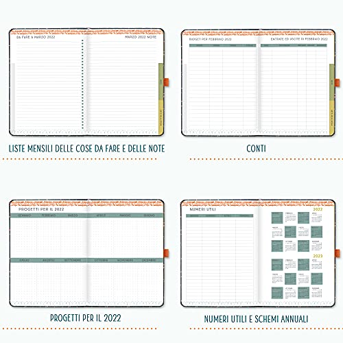 Bellissimo diario 2022 A5 ricco di funzioni rimane piatto da aperto e si chiude con un elastico. Con segnalibri, elastico porta penna e tasca sul retro per i documenti.