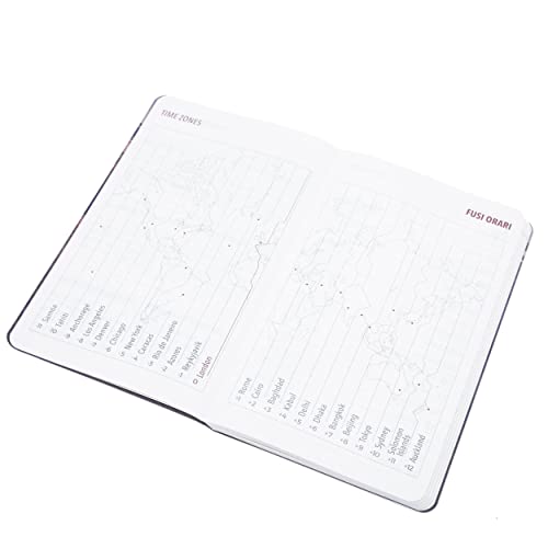 All'interno planning annuale, mappa del globo con i fusi orari e pagine libere per note e pensieri