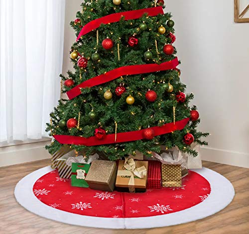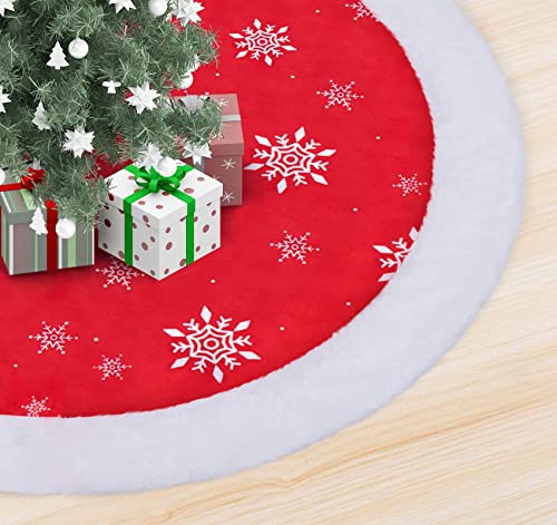 Agoer Gonna Natalizia dell'Albero Rotonda 90CM, Copertura Bianca Rossa con Modello di Fiocco di Neve, Decorazione in Pelliccia Sintetica per Natale
