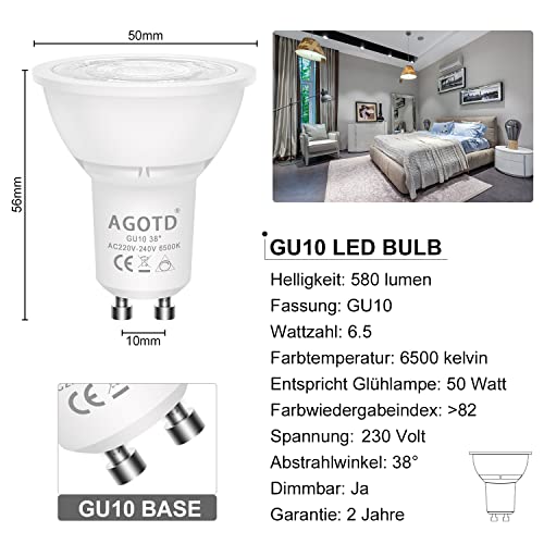 AGOTD 6,5W Dimmerabile Lampadine GU10 LED Faretti, 6500K luce bianca fredda, Lampadina LED faretto GU10 Bianco Freddo Equivalente alogeno 50W, Fasci stretti a 38°, 6 Pezzi