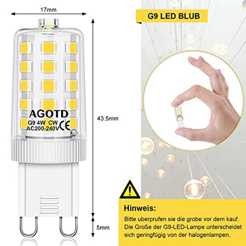AGOTD 4W G9 LED Lampadine, Lampade LED Bianche Freddo da 6000K, Equivalente a 40W Lampada Alogena, 400LM, AC220-240V, Angolo di visione 360°, Confezione da 10