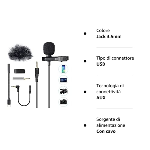 AGPTEK Lavalier Microfono per PC Smartphone con Clip e Un Parabrezza Incluso Adattatore Tipo-c Microfono Esterno Trust Ideale per Youtuber Intervista Conferenza Video Camera Podcast Cavo da 2M