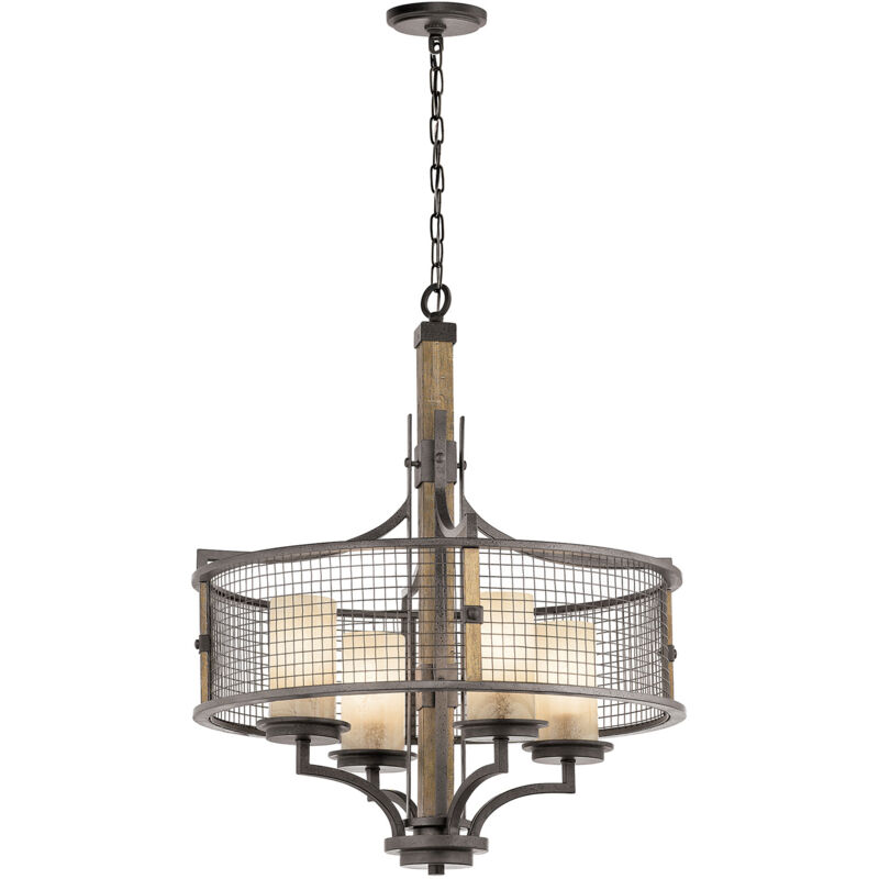 Collezione Ahrendale L'ESSENZA DEL RUSTICO Lampadario a 4 luci . Lo stile rustico della collezione Ahrendale apre nuove possibilità per ottimizzare il vostro arredamento. La rete aperta in ferro circonda e protegge i paralumi in vetro-mica, che a loro volta diffondono un'illuminazione soddisfacente e confortante nella vostra casa.