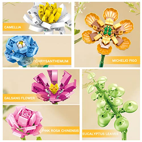 【Fiori Artificiali Building Blocks】: Il nostro kit costruzione in mattoncini contiene 6 tipi di fiori: Michelio Figo, Fiore di Galsang, Camelia, Rosa blu, Rosa cinese ed Eucalipto, che è un bouquet combinato progettato, molto bello, può abbinarsi a vasi (vaso non incluso) decorazioni per la casa, perfetto per decorare ovunque in casa o sul posto di lavoro.