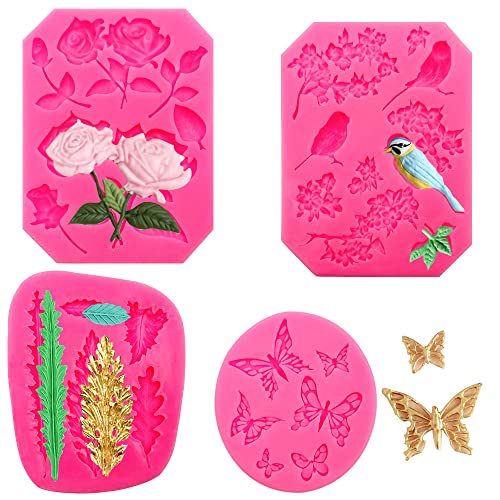 Set di valori: riceverai 4 stampi in silicone rosa di diverse forme, ovvero uccelli, farfalle, rose, foglie, le forme ricche soddisferanno le tue diverse esigenze e renderanno la tua decorazione più distintiva.
