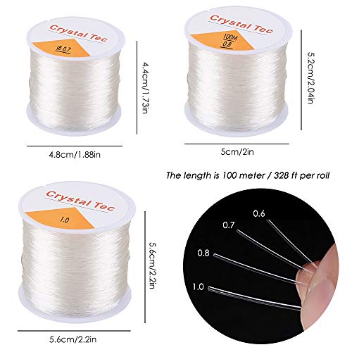 IL PACCHETTO COMPRENDE: 100 m / rotolo, 4 rotoli di perline elastiche trasparenti con 4 dimensioni di diametro (0,6 mm, 0,7 mm, 0,8 mm, 1 mm) per soddisfare le diverse esigenze di fabbricazione dei braccialetti.